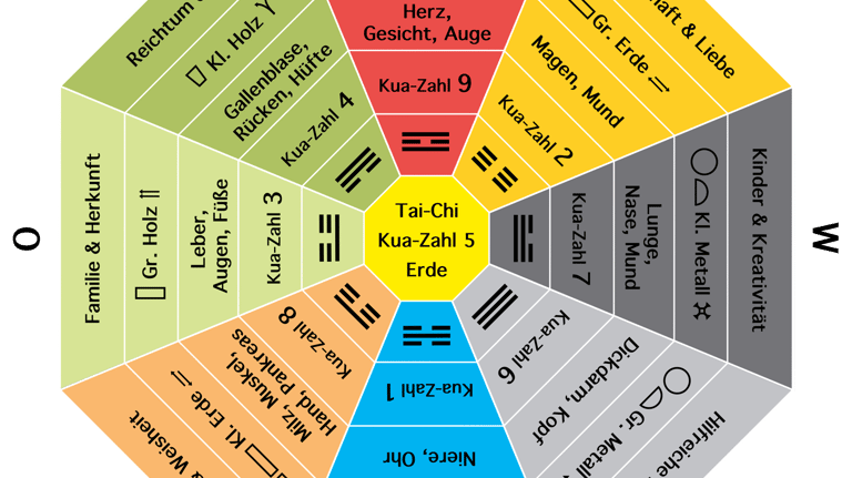 Die Bagua-Karte ist ein energetisches Raster, das auf den Grundriss des Raumes gelegt wird, um verschiedene Lebensbereiche (z.B. Karriere, Gesundheit, Wohlstand) zu stärken und diese gezielt zu fördern.